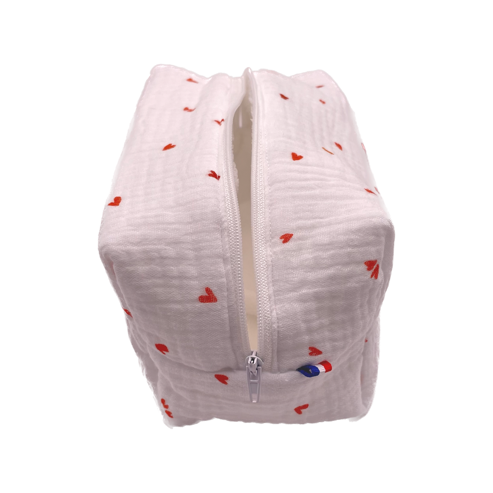 Trousse de toilette confectionnée à la main avec soin. Coton Oeko-Tex certifié à l'extérieur, doublure intérieure protectrice et fermeture éclair robuste.
